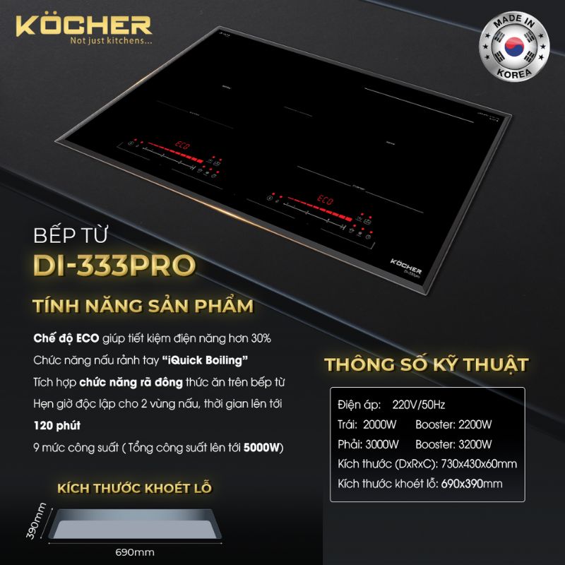 Bếp từ 2 vùng nấu Kocher DI-333Pro là sản phẩm bếp từ 2 vùng nấu rộng rãi, tích hợp những công nghệ tiên tiến đối với dòng bếp từ. Bạn có thể đồng thời chế biến nhiều món ăn ngon cùng lúc cho gia đình. Thiết kế sang trọng và tinh tế với các tính năng nổi trội, Hẹn giờ độc lập cho 2 vùng nấu, thời gian lên tới 120 phút.