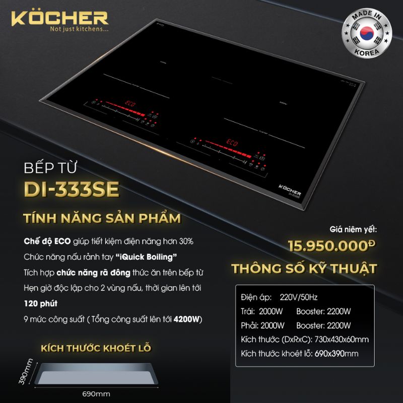 Trong thế giới nội thất bếp ngày càng phát triển, việc lựa chọn một chiếc bếp từ không chỉ đáp ứng nhu cầu nấu nướng mà còn tôn lên vẻ đẹp và sự tiện nghi cho không gian sống là điều mà nhiều gia đình quan tâm. Bếp từ Kocher DI-333SE, với xuất xứ từ Hàn Quốc và chế độ bảo hành lên đến 3 năm, nổi lên như một ứng cử viên sáng giá, hội tụ đầy đủ yếu tố từ thiết kế tinh tế, công nghệ hiện đại đến tính năng an toàn vượt trội.