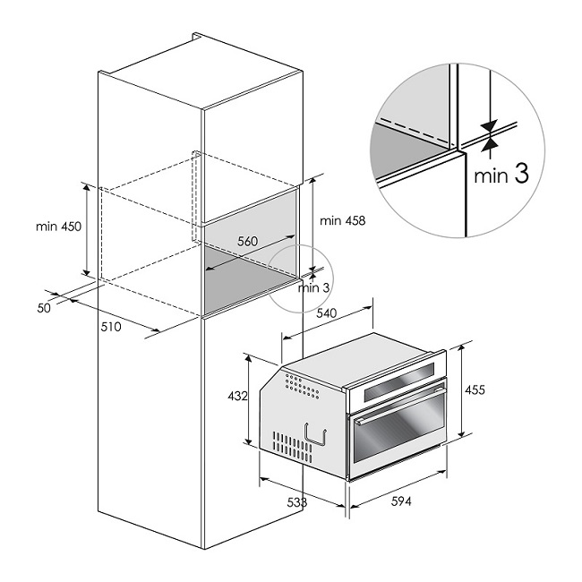 – Kích thước lắp đặt (dài, rộng, sâu): 560 x 458 x 560mm.