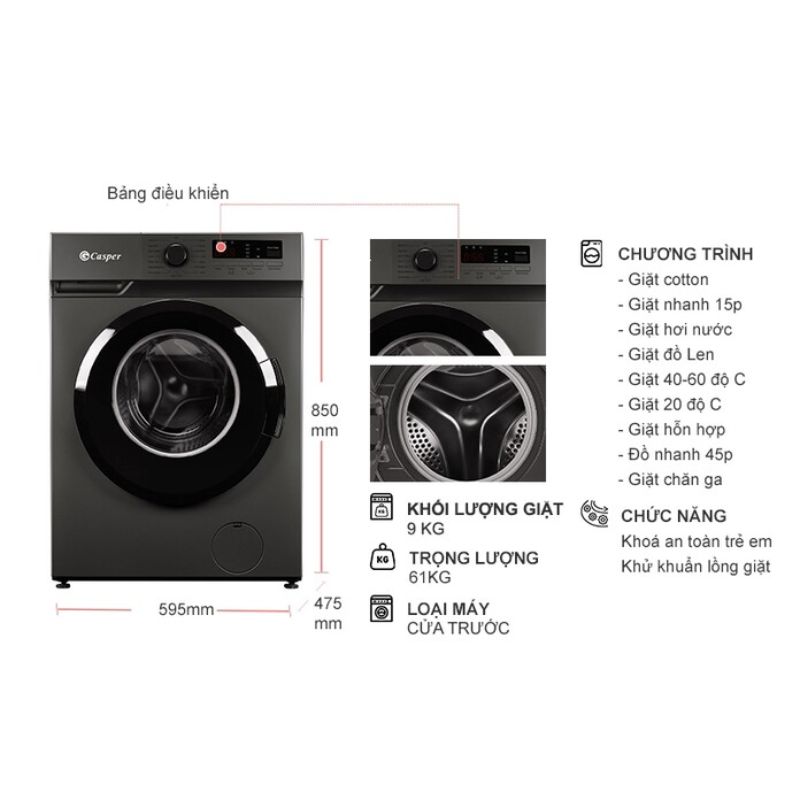 Máy Giặt Casper Inverter 9 Kg WF-9VG1 cửa trước