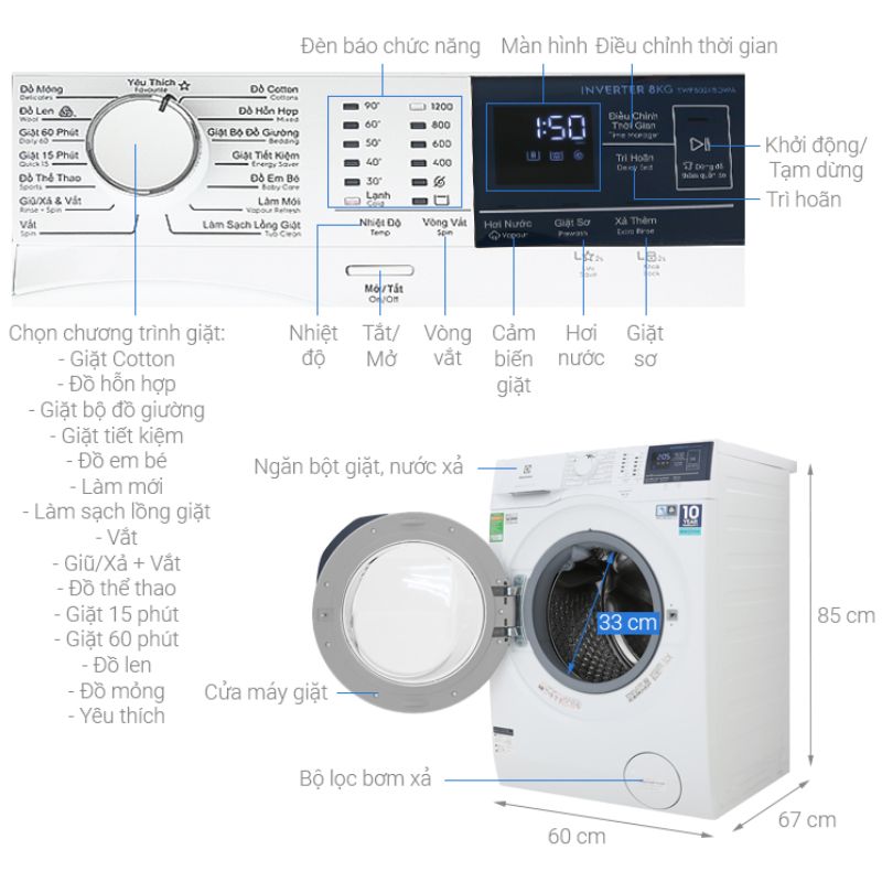 – Diệt khuẩn, khử trùng với chế độ giặt nước nóng hiện đại.