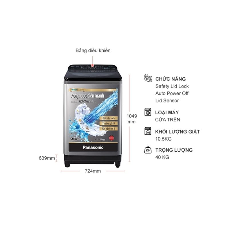 - Thiết kế sang trọng, nắp máy kính giảm tốc: Máy Giặt Panasonic Inverter 10.5 Kg NAFD10XR1LV có thiết kế sang trọng và hiện đại, mang đến vẻ ngoài tinh tế cho không gian giặt của bạn.