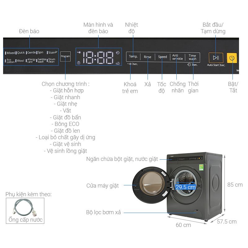 | Tính năng khác | Chống nhăn Khóa trẻ em Khử trùng lồng giặt ở 90°C Thêm đồ trong khi giặt Tự khởi động lại khi có điện |