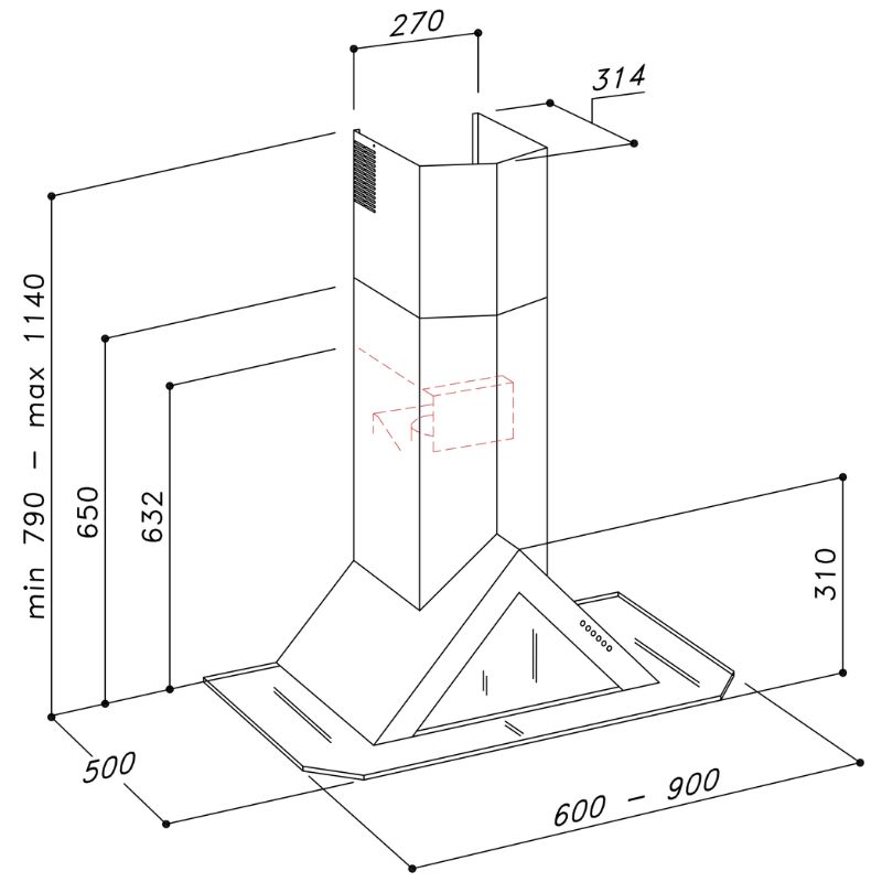 – Máy hút mùi áp tường trang trí hình nón kính thẳng và Inox 304.