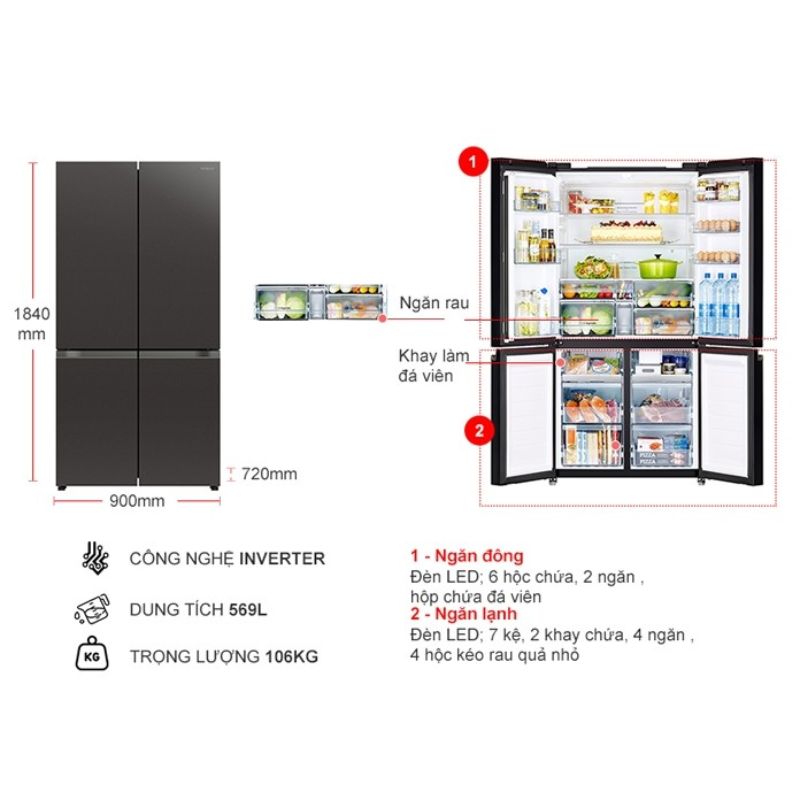 - Thiết kế sang trọng: Mẫu tủ lạnh Hitachi nhiều cửa Inverter 569 Lít R-WB640PGV1 GMG sở hữu thiết kế mượt mà với tay nắm phẳng tinh tế, góp phần tạo nên nét trang nhã và hài hòa cho không gian bếp của gia đình. Ngăn lạnh được hãng bố trí ở trên do nhu cầu sử dụng thường xuyên. Nhờ vậy, giúp bạn sử dụng được tiện lợi hơn. Không gian lưu trữ lớn còn giúp bạn dễ dàng nhìn thấy tất cả mọi thứ trong tầm mắt, dễ dàng lấy hay đặt thực phẩm vào bên trong. Các khay kệ được làm từ kính chịu lực giúp bảo quản thực phẩm bên trong tủ mà không lo kính sẽ bị nứt vỡ. Bảng điều khiển màn hình LED giúp bạn dễ dàng theo dõi và thao tác với máy, bên cạnh đó còn tăng thêm phần hiện đại và sang trọng cho sản phẩm. Với dung tích 569L, tủ lạnh mang đến không gian bảo quản thực phẩm rộng lớn, phù hợp cho gia đình có trên 5 thành viên sử dụng, hay các gia đình có nhu cầu bảo quản lượng lớn thực phẩm.